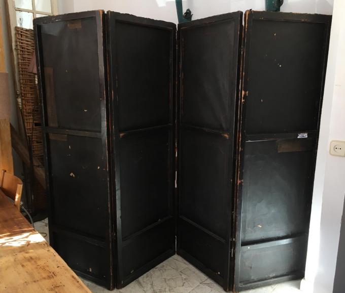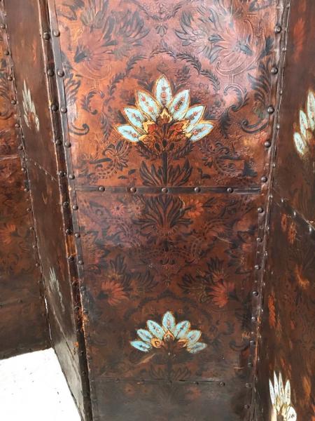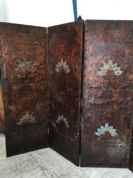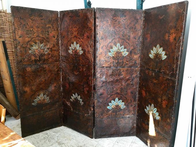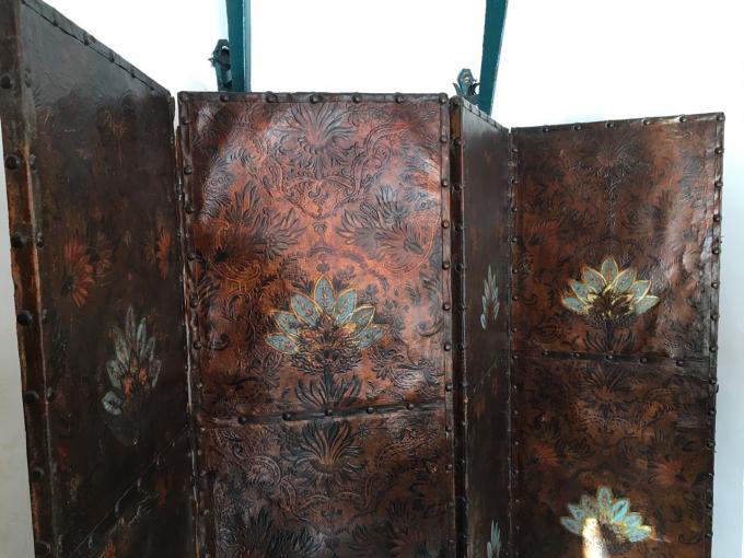 PARAVENT. SIECLE XVII - XVIII. FRANCE. CUIR EMBOSSAGE ET POLICHROMÉ. 248X182 CMS